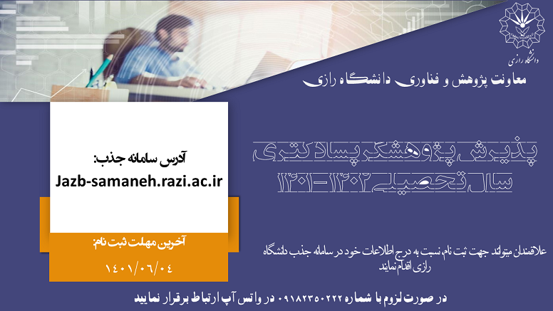 دانشگاه رازی از میان دانش‌‌آموختگان مقطع دکتری داخل یا خارج از کشور که علاقه‌مند به دوره‌‌های پسادکتری می‌باشند، پژوهشگر می‌پذیرد.