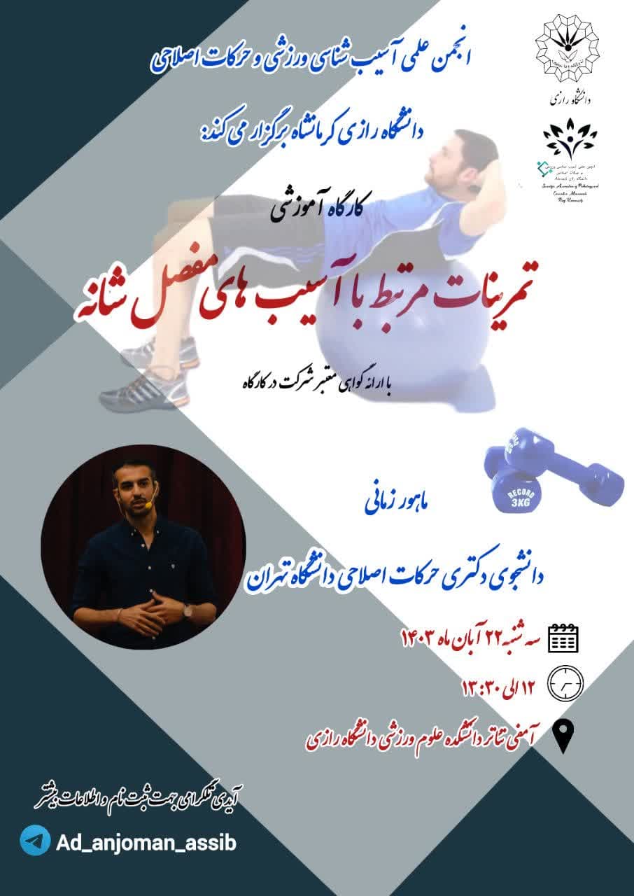 به همت انجمن علمی آسیب شناسی ورزشی و حرکات اصلاحی دانشگاه رازی کرمانشاه کارگاهی آموزشی تحت عنوان تمرینات مرتبط با آسیب مفصل شانه در روز سه شنبه ۲۲ آبان ماه از ساعت۱۲ الی۱۳:۳۰ در آمفی تئاتر دانشکده علوم ورزشی رازی با حضور جناب آقای ماهور زمانی دانشجوی دکتری حرکات اصلاحی دانشگاه تهران و ۱۰۰ نفر از دانشجویان دانشگاه رازی، مربیان ورزشی و دانشجویان دانشگاه آزاد و علوم پزشکی برگزار شد
